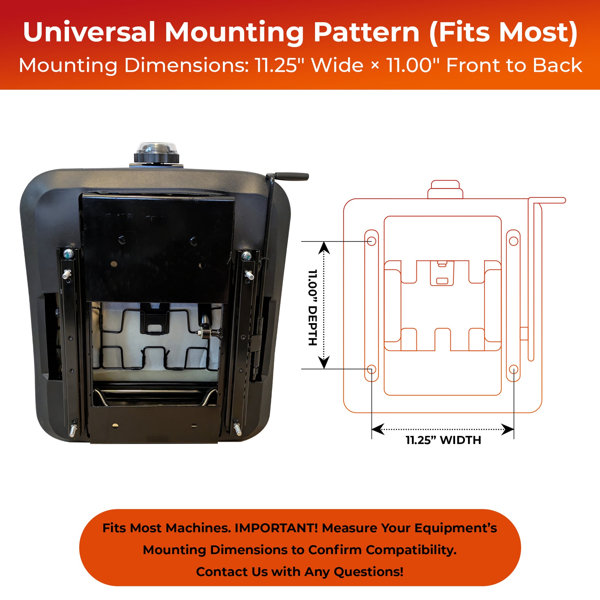 Fitment & Compatibility: CONFIRM FITMENT BEFORE PURCHASING! Designed to fit a wide variety of equipment with a standard mounting bolt pattern of 11.25" W (side to side) x 11" D (front to back). Built to Last: High-durability black and dark gray PVC cover resists cracking and fading. Bolstered edges and hot-stamped details add both support and style.